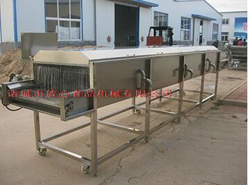 清洗機采用水浴式氣泡清洗,物料在水中通過氣泡在釋放過程中產生的翻騰效果,使物料在水中發生不規則的強烈翻轉運動,通過物料的運動有效分離被清洗物表面附著物,模擬人工清洗基本動作,同時由于物料是在汽水混合物中產生的翻騰運動,有效避免了清洗過程中產生的碰、磕、劃傷等對物料的損傷現象,提高了工作效率,變人工作業為機械化加工。適合于各種新鮮水果、蔬菜、鹽漬菜、菌類、海產品。該清洗機在物料輸送過程中,增加了噴淋清洗功能,使物料在完成汽水浴清洗后,再經過噴淋清洗,該道工序的作用是將物料表面的臟水替換去除,提高物料的清洗效果,同時,外來的清潔噴淋水在對物料進行二次清洗后,水自動流入水浴槽中,達到替換補充水浴槽內的清洗水,保持了水浴槽內水質的清潔度,即提高了清洗水的利用率,又增加了清洗效果。